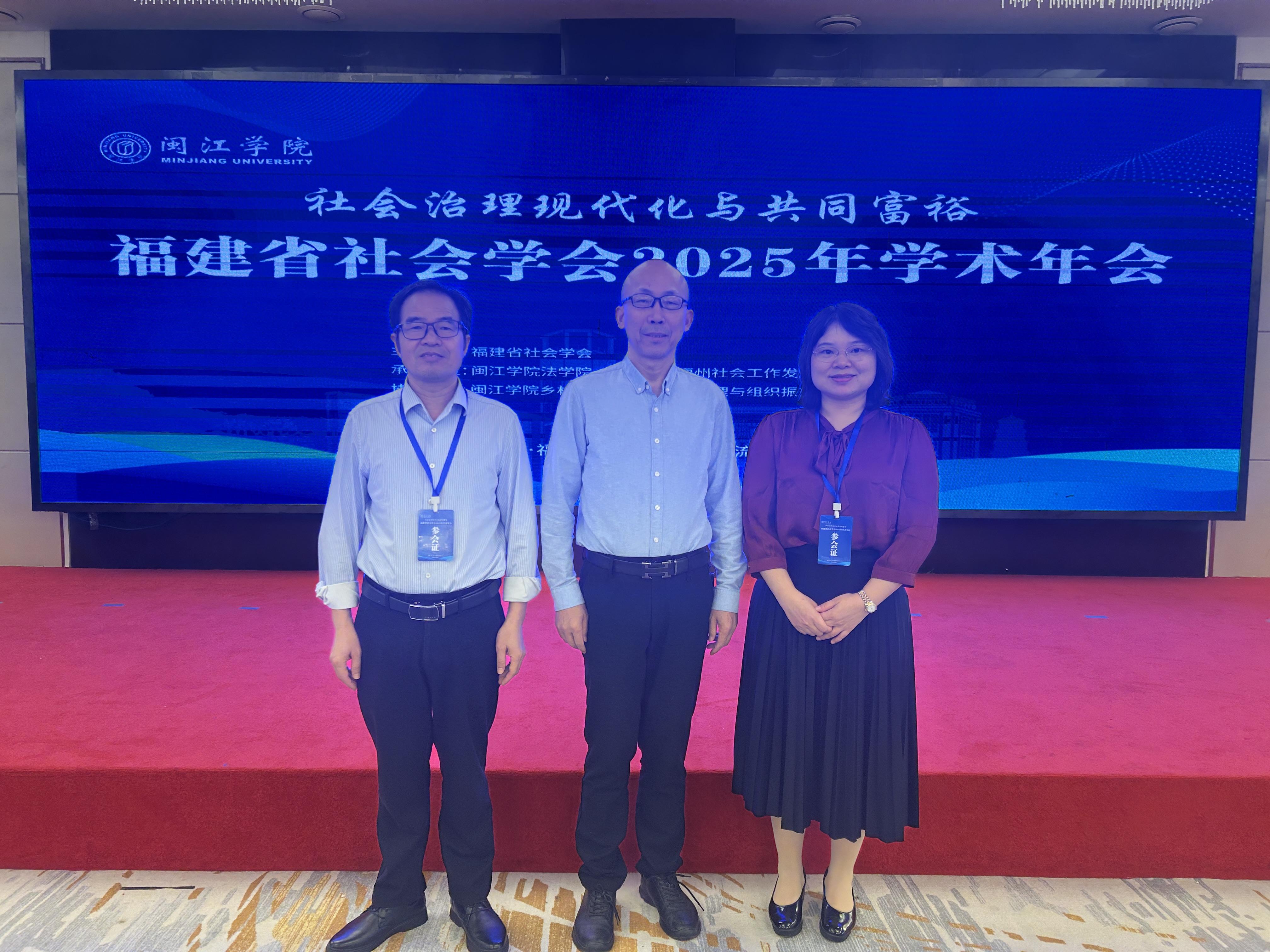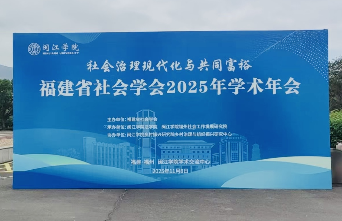 11月8日,福建省社会学会2025年学术年会于闽江学院举行。本次年会由福建省社会学会主办,闽江学院法学院、闽江学院福州社会工作发展研究院承办,闽江学院乡村振兴研究院乡村治理与组织振兴研究中心协办。此次年会以“社会治理现代化与共同富裕”为主题,分设7个平行论坛,围绕数字化转型与人工智能,养老保障与健康老龄化,青年发展与职业研究,女性、母职与家庭研究,乡村振兴与基层治理,社会工作服务创新与文化变迁,福州社会工作高质量发展等主题展开学术交流。