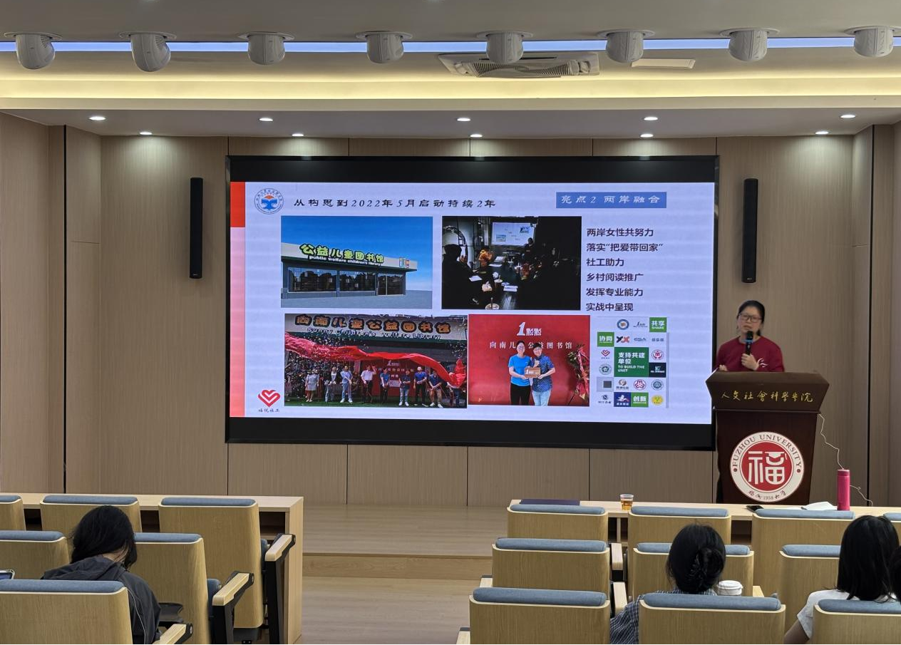 接着,林老师分享了第二个典型案例“向南儿童公益图书馆”。这一项目源于林老师对自身成长环境的真切体会。她推己及人,感受到福州向南地区儿童在阅读教育上的缺失。于是,由“一点点”奶茶店与福悦社会工作发展中心联合创建的公益图书馆落地仓山区城门镇。其独特之处可概括为“把爱带回家”、“两岸融合”、“专业社工服务”与“联动平台”。在日常运营中,“社工+志愿者”联动模式得到了生动体现:社工发挥引领作用,为孩子们提供心理支持与交流辅导,多名台胞志愿者热情参与,两岸联动,携手共创。