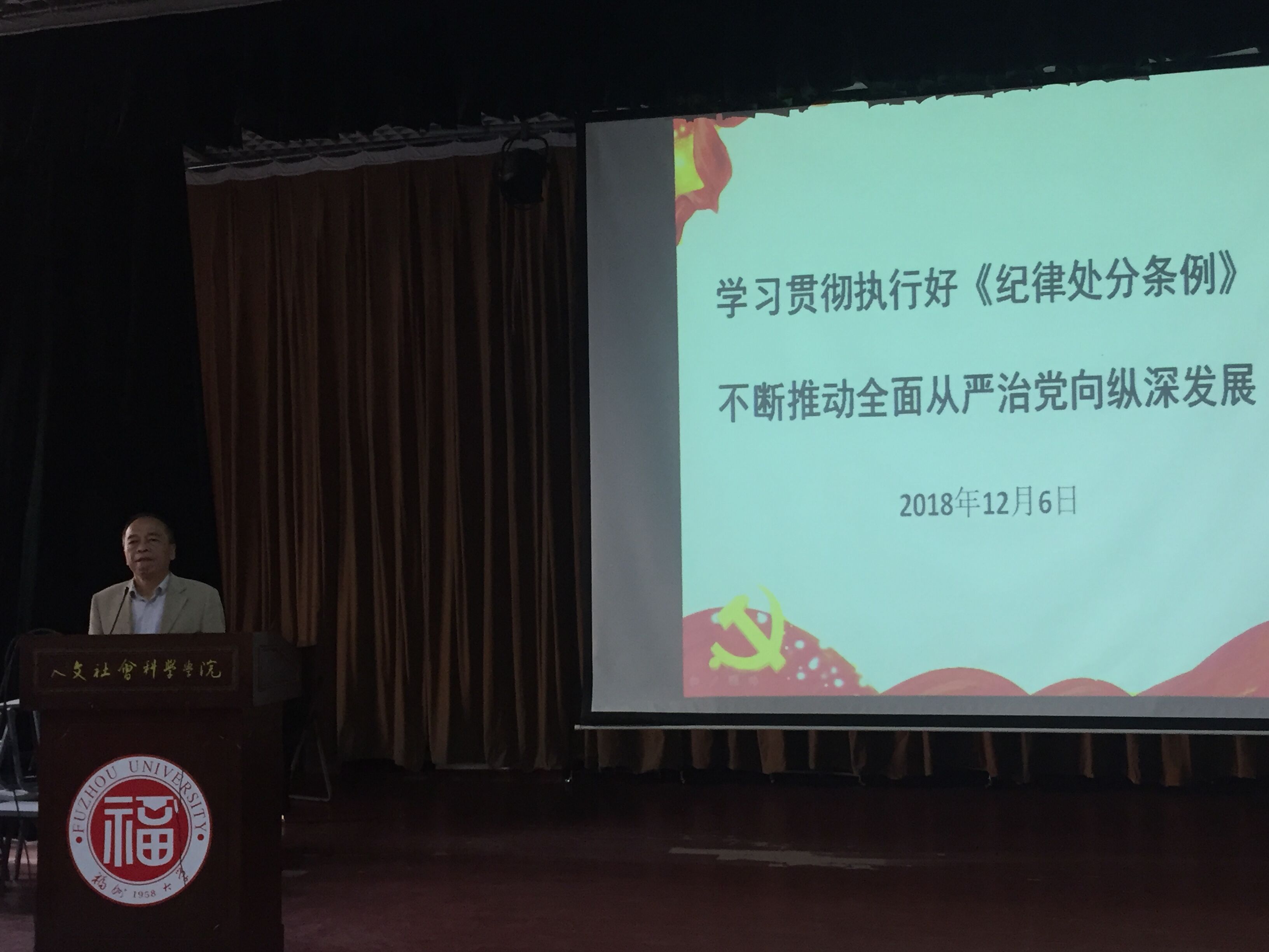 12月6日下午,人文学院在人文艺术实践基地召开全院党员党风党纪学习教育学习会,由院党委书记林秋生作《学习贯彻执行好< 纪律处分条例>,不断推动全面从严治党向纵深发展》的专题报告。学院教师党员、学生党员共计120余人听取了此次报告会。