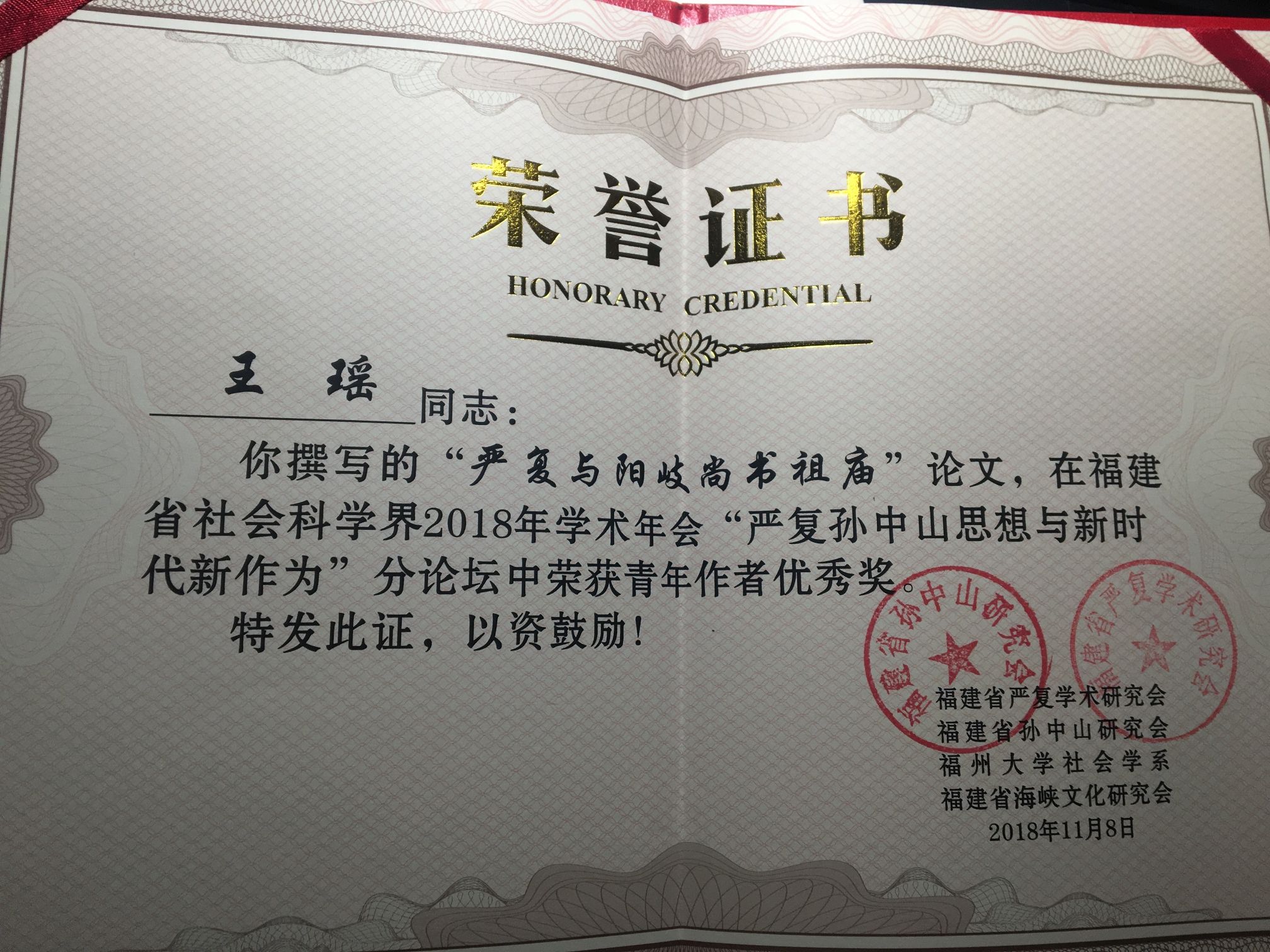 社会学系研究生王瑶同学提交的《严复与阳岐尚书祖庙》一文荣获青年作者优秀奖,并在论坛做汇报交流。