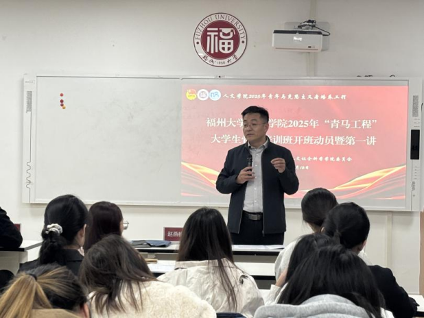 12月18日下午,人文学院“青年马克思主义培养工程”大学生骨干培训班开班动员暨第一讲在学生活动中心117教室召开,学院党委副书记赵燕松、团委书记齐朝阳、辅导员陈天龙出席活动。