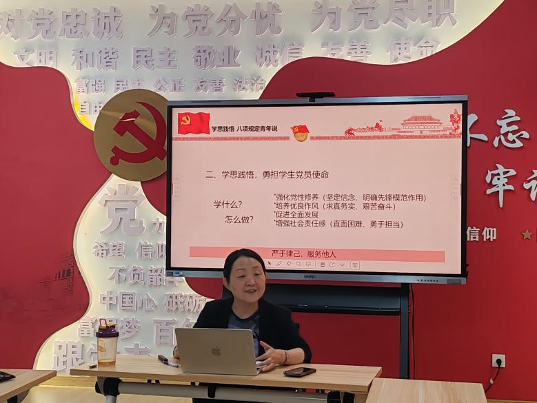 接着,赵陵波老师为支部全体党员作《学思践悟,八项规定青年说》党课讲授。她围绕中央八项规定出台的背景,结合党的宗旨目标,指出《中共中央八项规定》文件出台对于党群关系的重要性。赵陵波老师面向支部全体学生党员提出“严于律己,服务他人”的作风要求,从强化党性修养、培养优良作风、增强社会责任感三方面激励大家立足自身实际,切实践行中央八项规定精神,勇担学生党员使命。