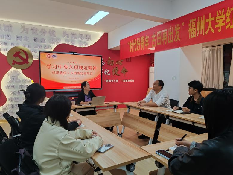 为扎实开展深入贯彻中央八项规定精神学习教育,提升学生党员党性修养,4月26日晚,人文学院本科生第一党支部在“一站式”学生社区党校开展“学思践悟,八项规定青年说”主题党日活动。人文学院党委委员、应用心理学系系主任赵陵波教授出席活动并担任主讲老师。活动由学院团委书记、本科生第一党支部书记齐朝阳主持,支部全体党员参加。